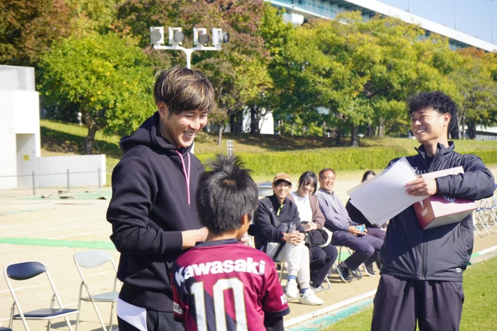 クリニックの終了後には、お楽しみ抽選会を実施。当社代表取締役社長の山根がくじ引きを行い、当選者5名には、タオルやサッカーボールなどヴィッセル神戸の公式グッズがプレゼントされました。さらに、最後の1名には 大迫勇也選手のサイン入りグッズ を贈呈!当選を祈りながら手を組む子供たちの姿や、名前を呼ばれて喜ぶ笑顔が微笑ましかったです。