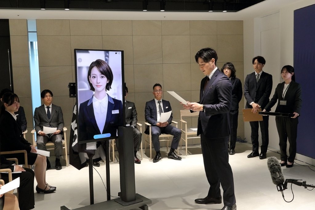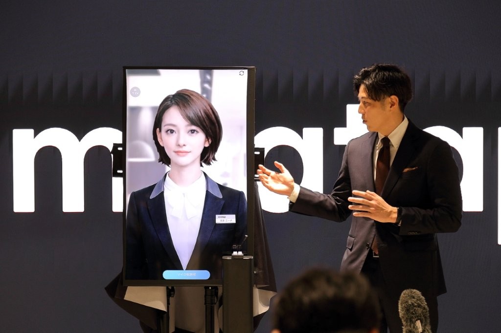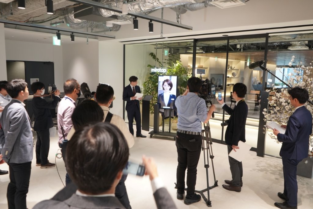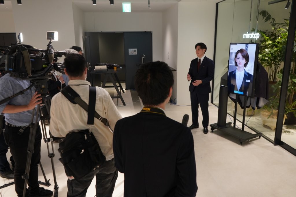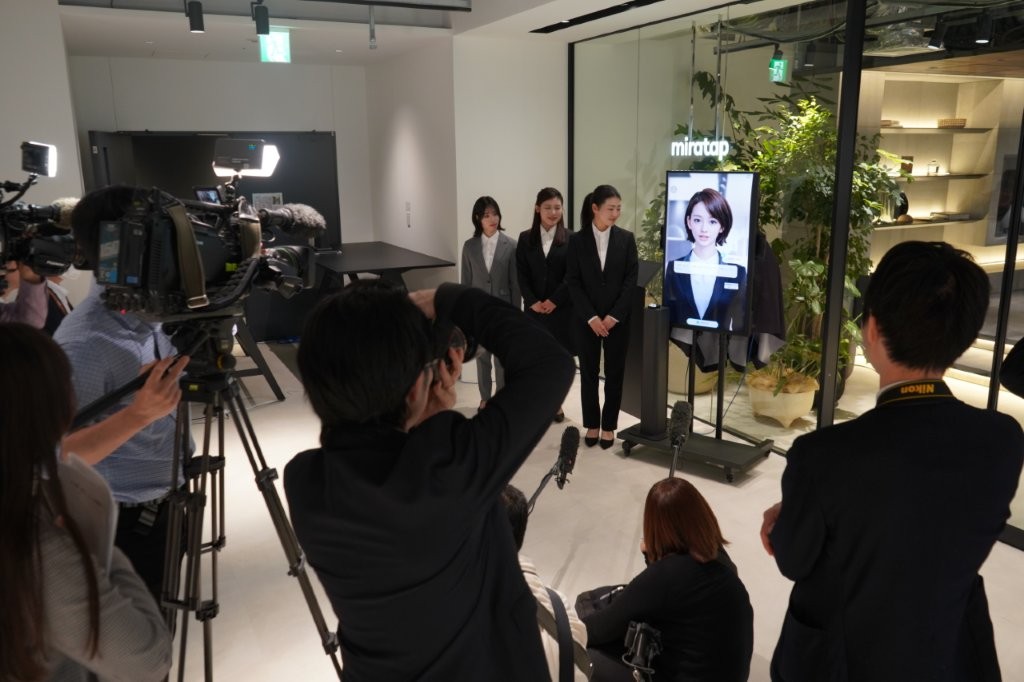 数多くのメディア関係者に囲まれる社長の山根とAI社員「美楽 ニーナ」
