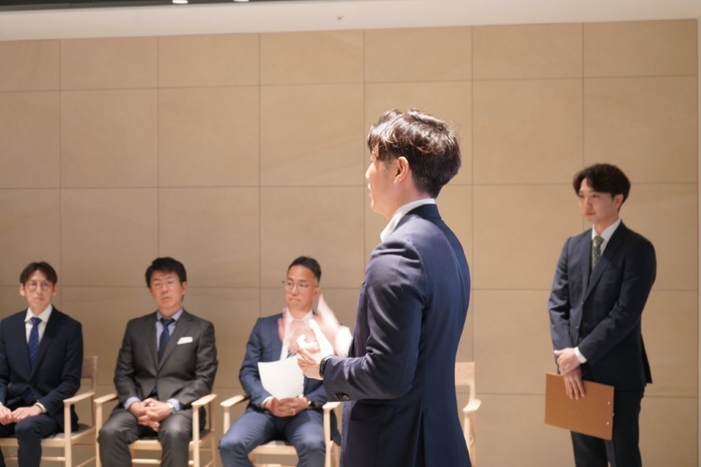 最後に副社長の津﨑が新入社員へ向け、メッセージを贈りました。「一人も欠けずにこの日を迎えられたことを嬉しく思います。同期は貴重な仲間であり、ライバルです。AI社員も仲間に加わったので、みんなで切磋琢磨し合いながら今後の業務に取り組んでほしい。」と激励しました。
