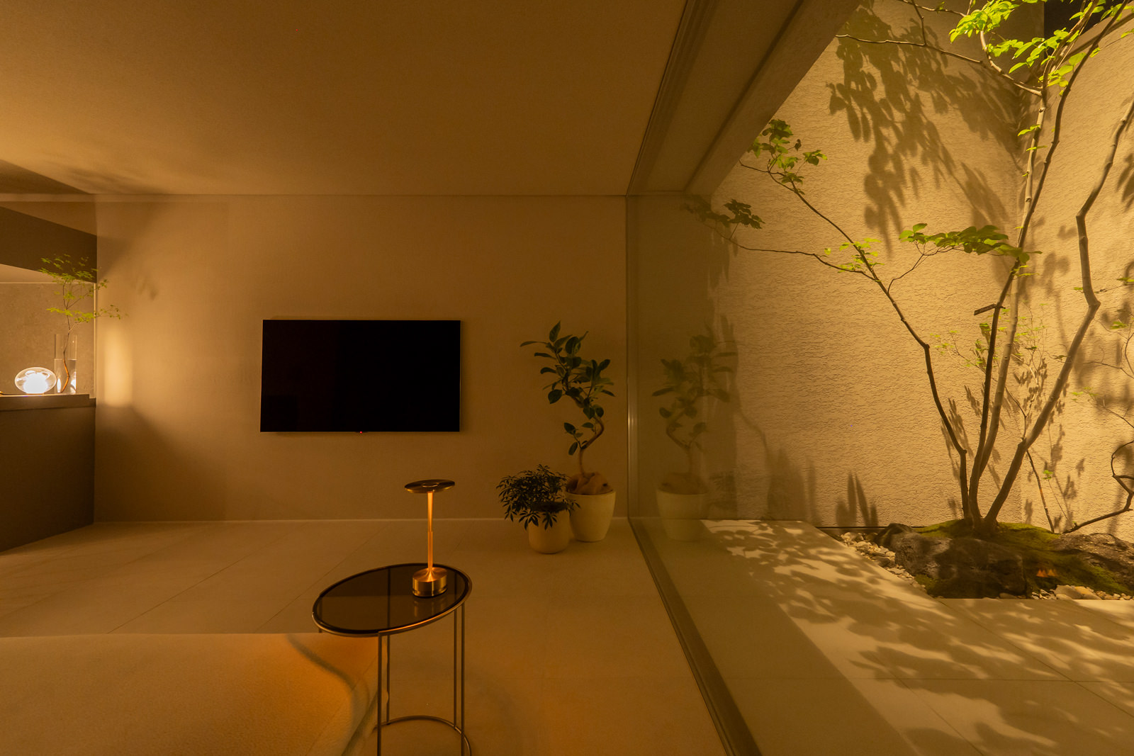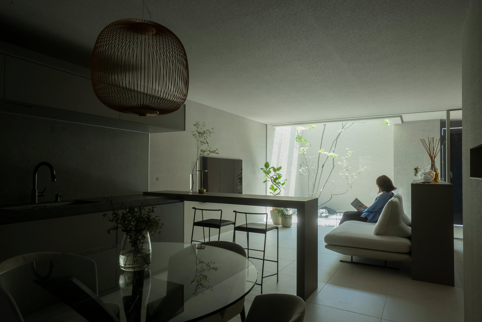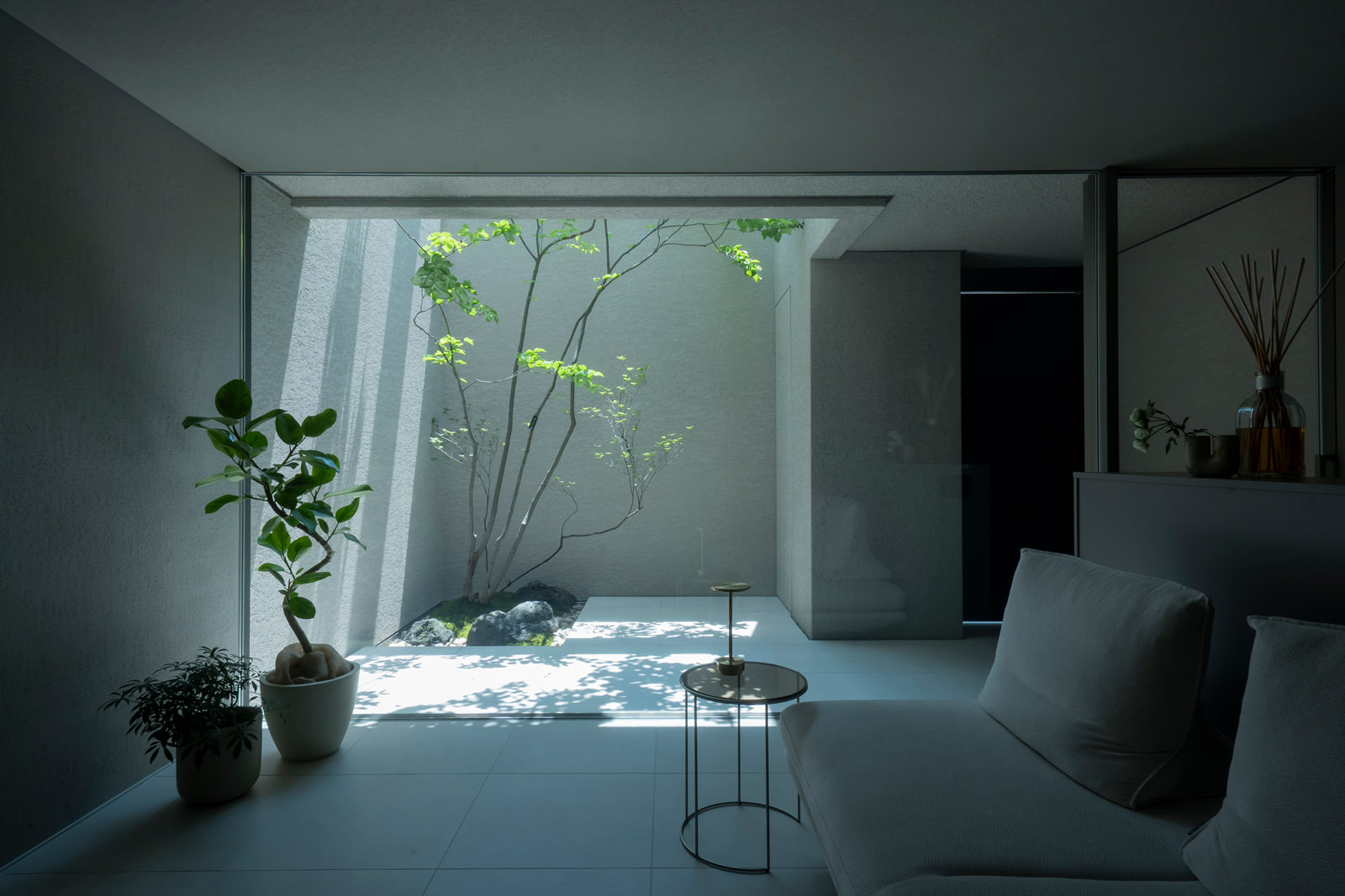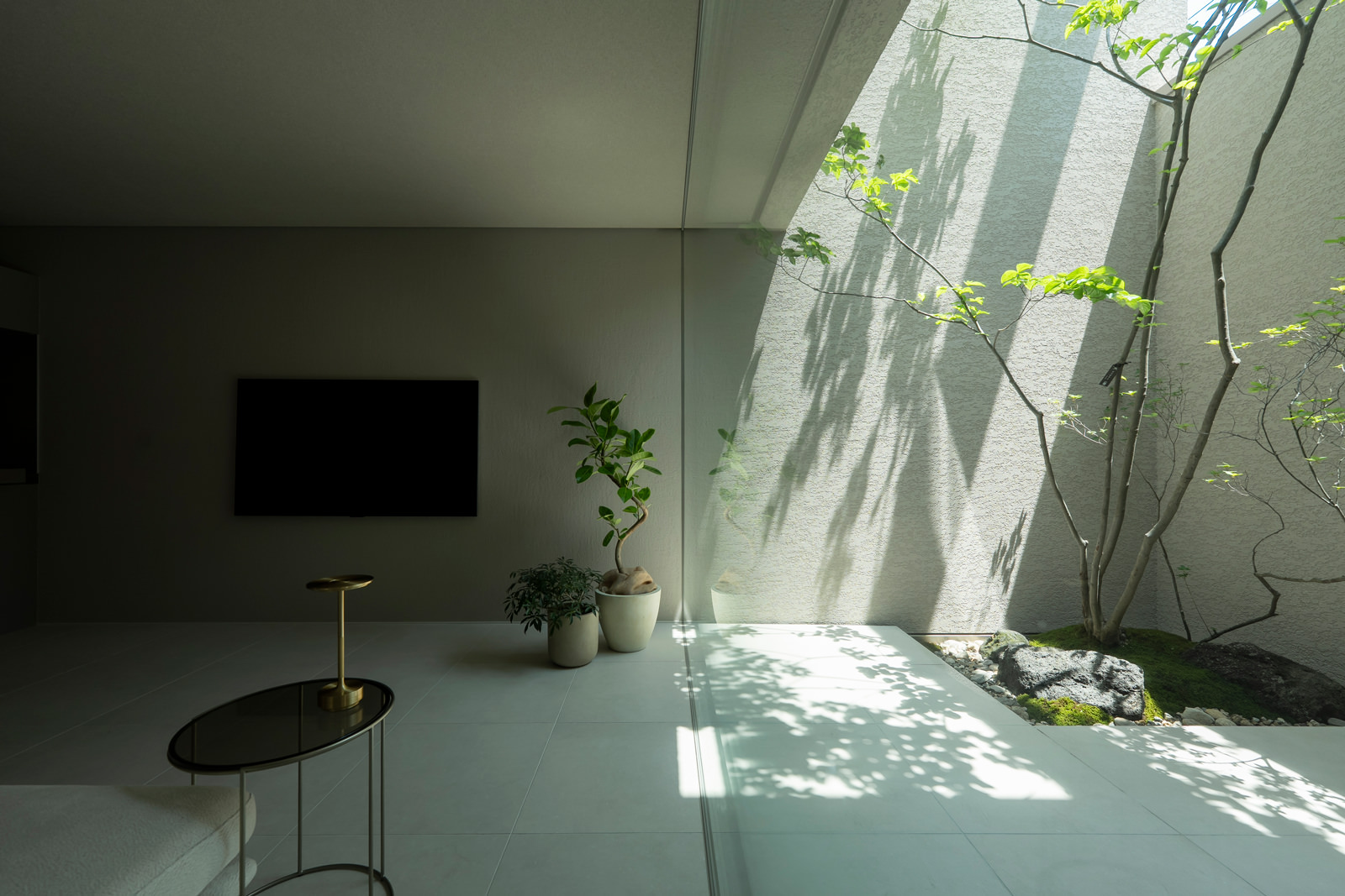 狭小地でも開放的にくらせる工夫をこらしました。家の出入り口を外部ドアとすることで、中庭が玄関として機能します。玄関のスペースが外部となることで、建物間口いっぱいのサッシを計画することができ、光が降りる庭と連続させることで広がりをもたせました。中庭の壁に当たる自然光が美しく見えるように、開口部の数を絞り、床や壁、天井を段差なく計画することで内外のつながりを強調させています。