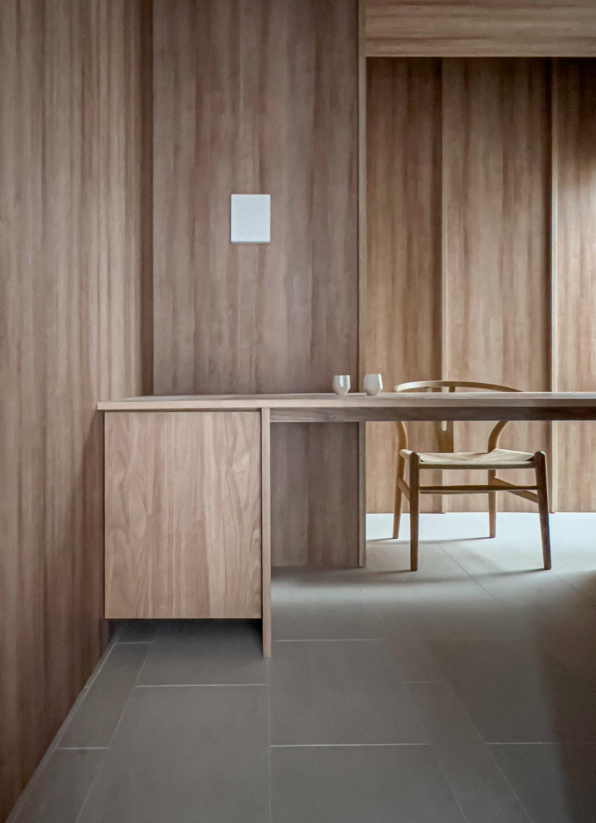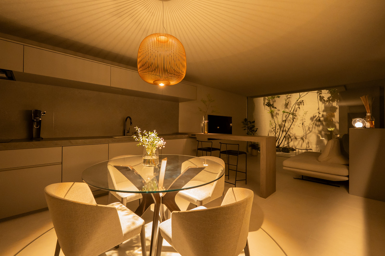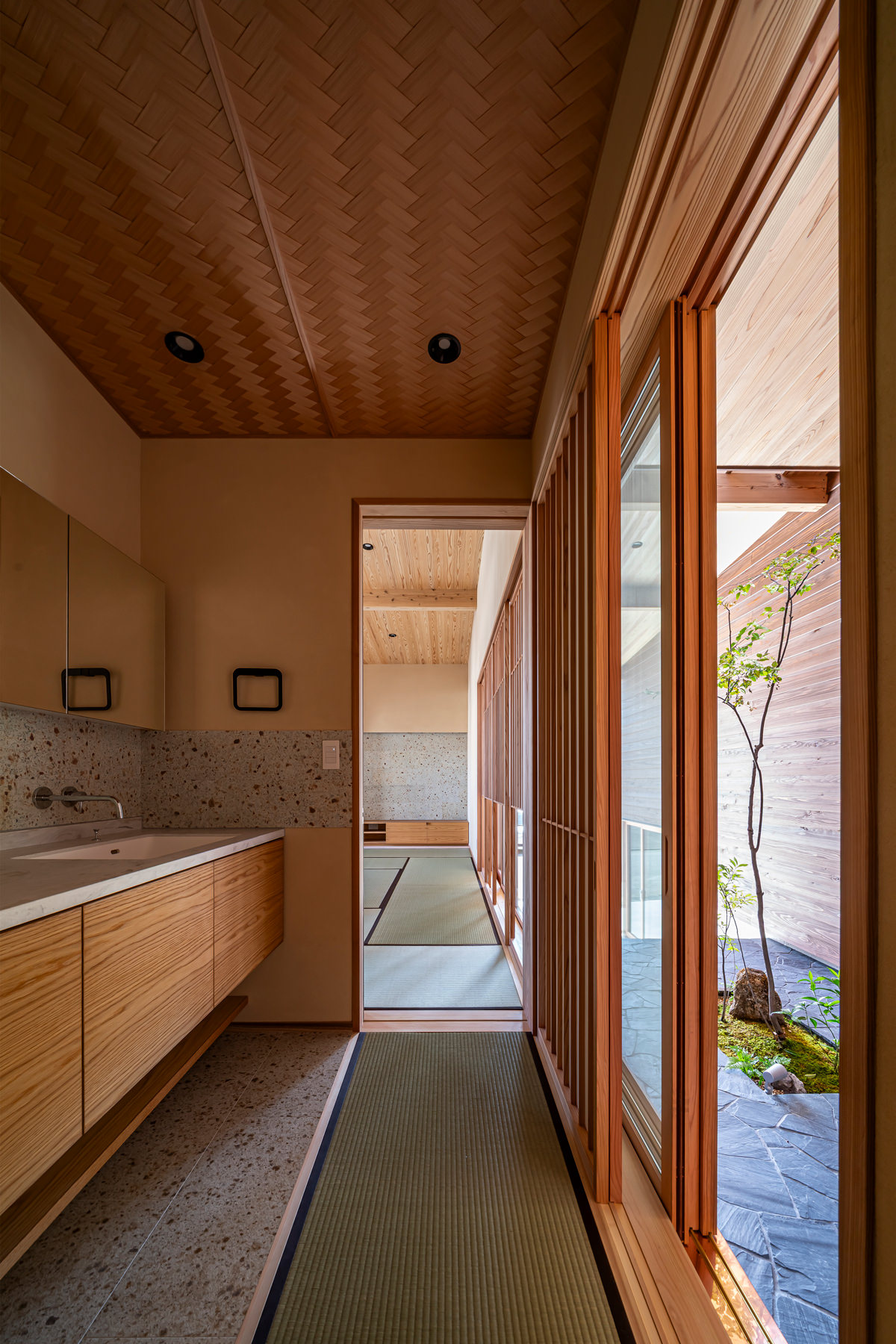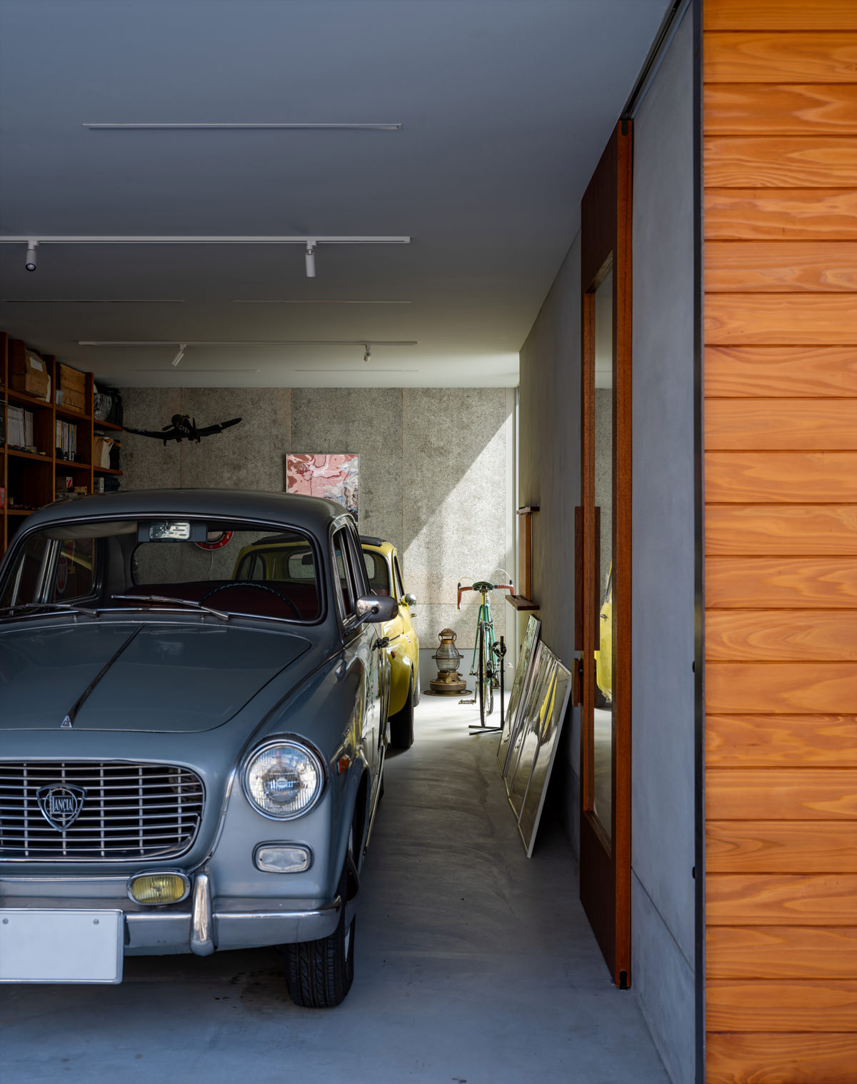 クラシックカーとアンティーク家具を愛する家族のための住まい。木毛セメント板やモルタル仕上げのガレージは、英国や伊国のバックヤードビルダーを思わせる素材感で趣を演出。中庭を囲むようにLDKや浴室、テラスを配置し、光と風が穏やかに巡る構成としました。浴室やキッチン、洗面には《ウォルノットホワイト》のタイルを採用。マットな質感が白を基調とした空間に温もりを添え、清潔感と上質さを両立しています。ポリカーボネート折板がやわらかな光を導き、エゴノキの咲く中庭とともに、季節を感じる穏やかなくらしを描きながら、慌ただしい日常の中にも、静かな豊かさと心の余白を感じられる住まいを目指しました。
