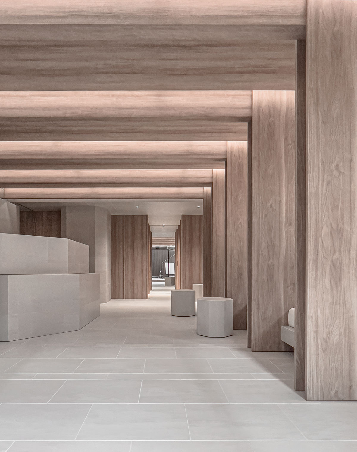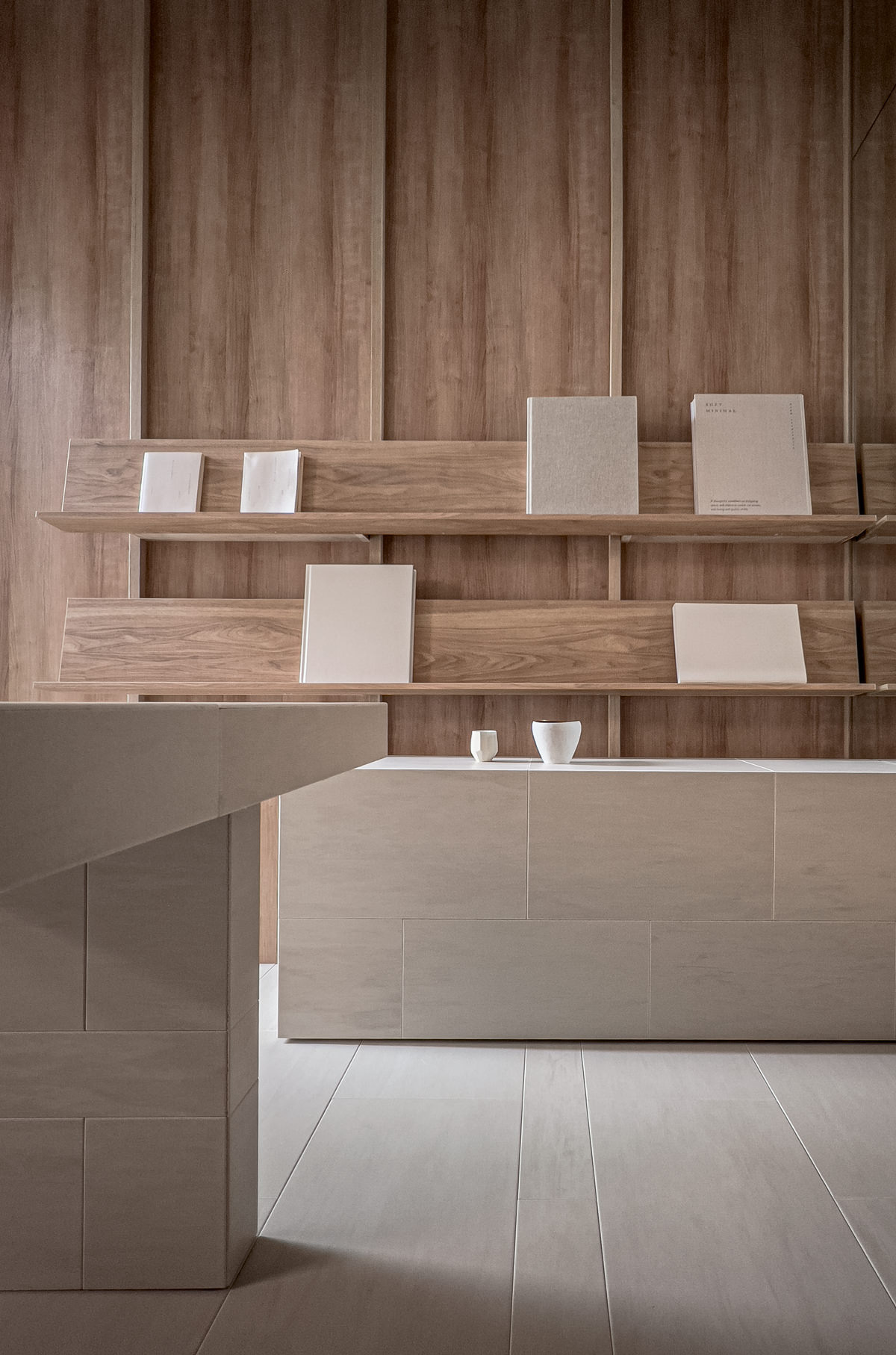 「開かれた場所」「社会に根ざし拠り所となる」を標榜する街の心療内科。往来とのつながりと適度な隔絶、リズム・凹凸・陰影、設備や事務機器の冷たさの排除など「居心地と安心感」の観点から空間を設える。たとえば待合席は個別に仕切り、他人との距離、姿勢が保持できず寄りかかってしまう、常に付添人に隣にいてほしい、など心療科特有の状況に配慮した。地下に張るどっしりとした根のような造形、角を落とし円へ近づく=再生、などの暗喩がブランディングに寄与するクリニック空間である。