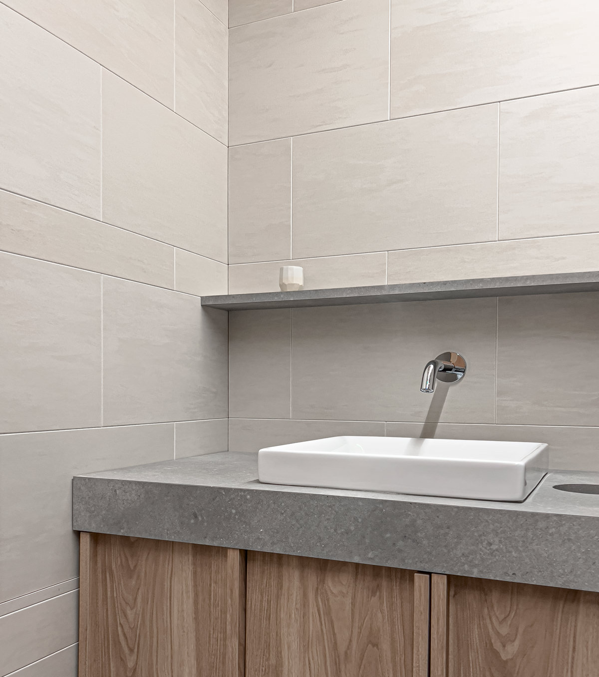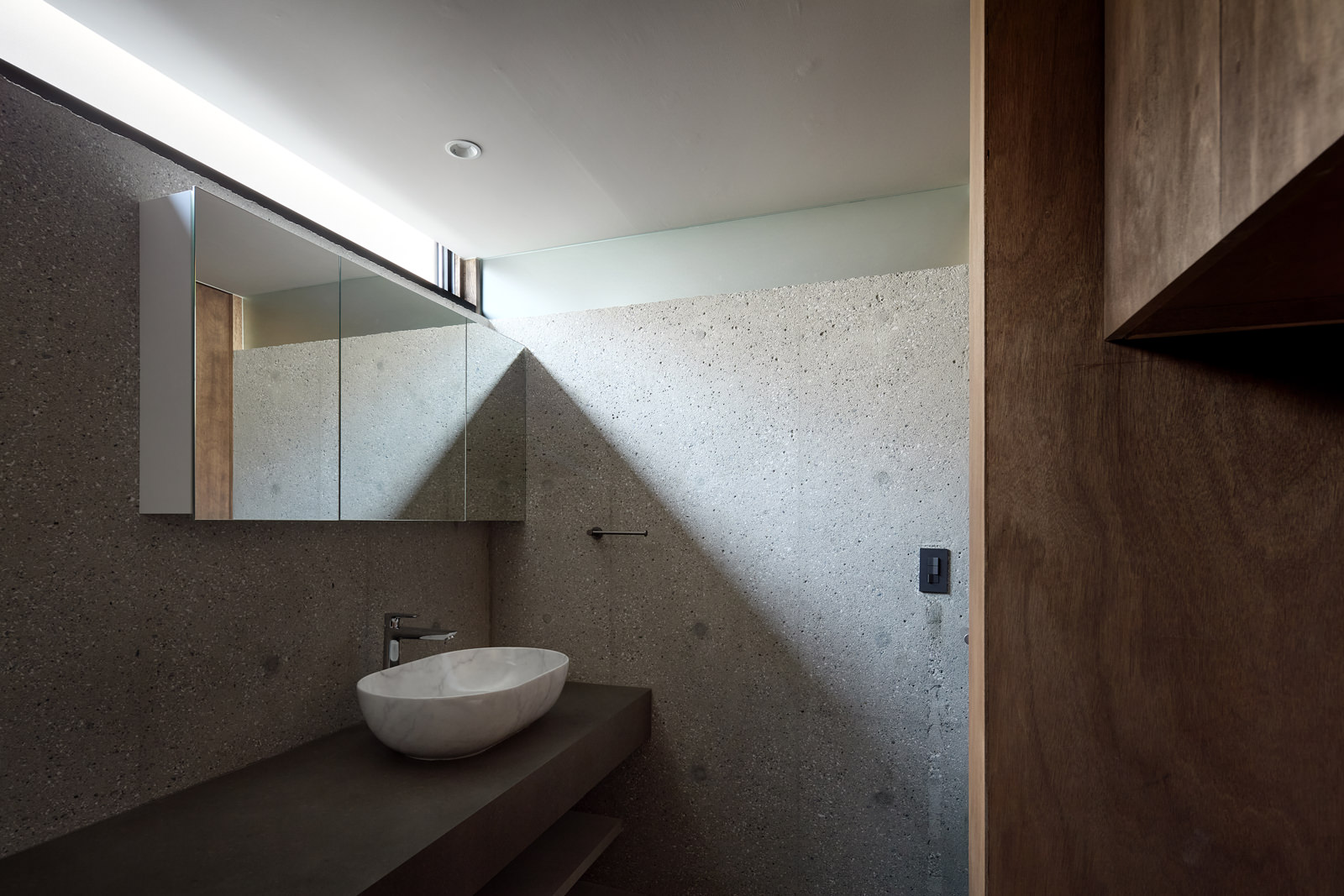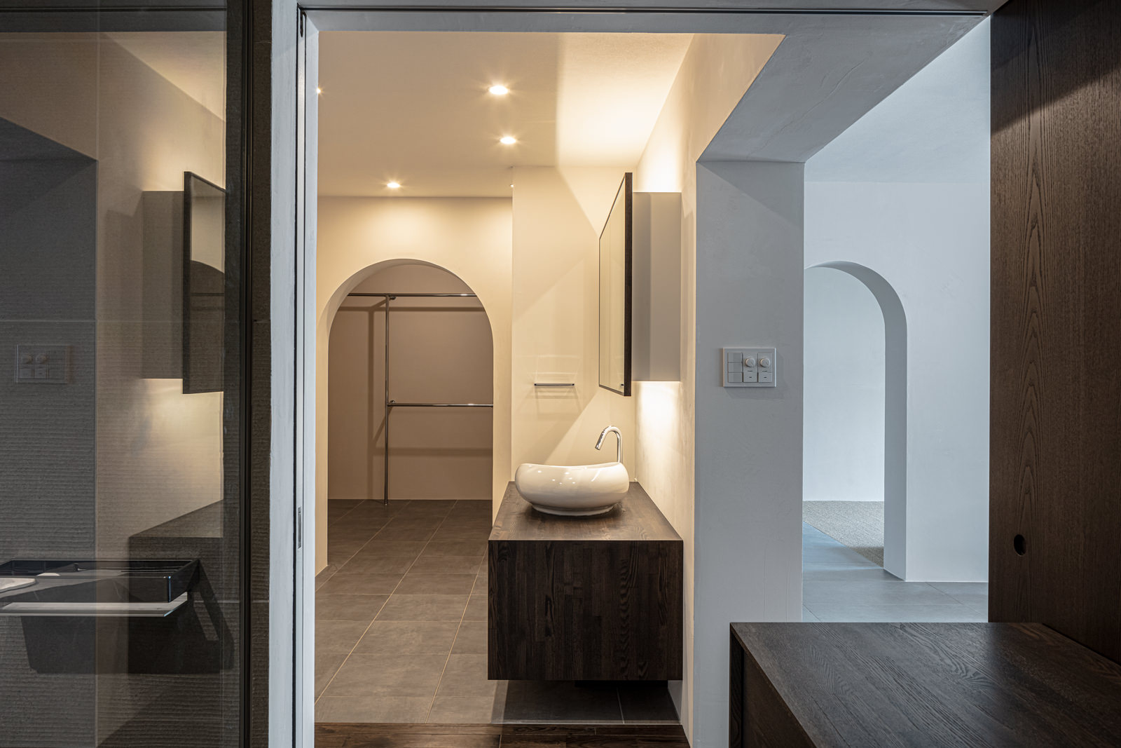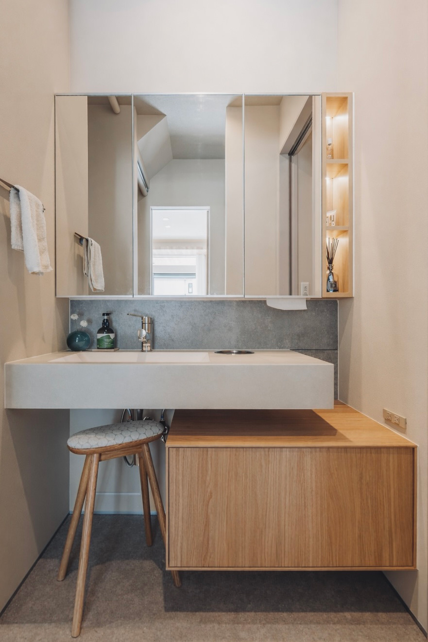 玄関正面のホールには洗面機能を設け、アクセントとして印象的な形の洗面器《モアイ71》を採用。また、水回りで使用可能な床タイル《ダスト》を使用することで、スライドウォールを開けた時に浴室を含めた空間が一体となる設計とした。