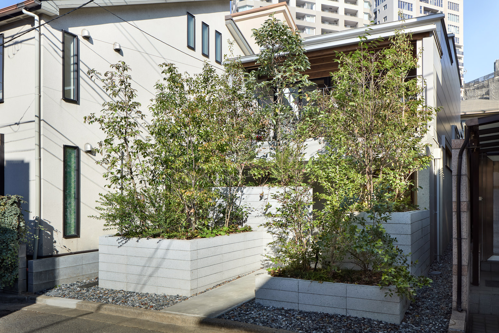 敷地周辺は、武蔵野台地の先端に位置し、低地面が入り組んで舌状の丘を作り出しているエリアです。段状に作った樹々を見上げる植栽ポットの隙間を「谷」と見立てて、住宅へのアプローチ動線とし、高さを抑えた玄関へと入っていきます。階段を上がった先には、目の前に緑が広がる「丘」の上を感じさせる開放的な空間が待っています。