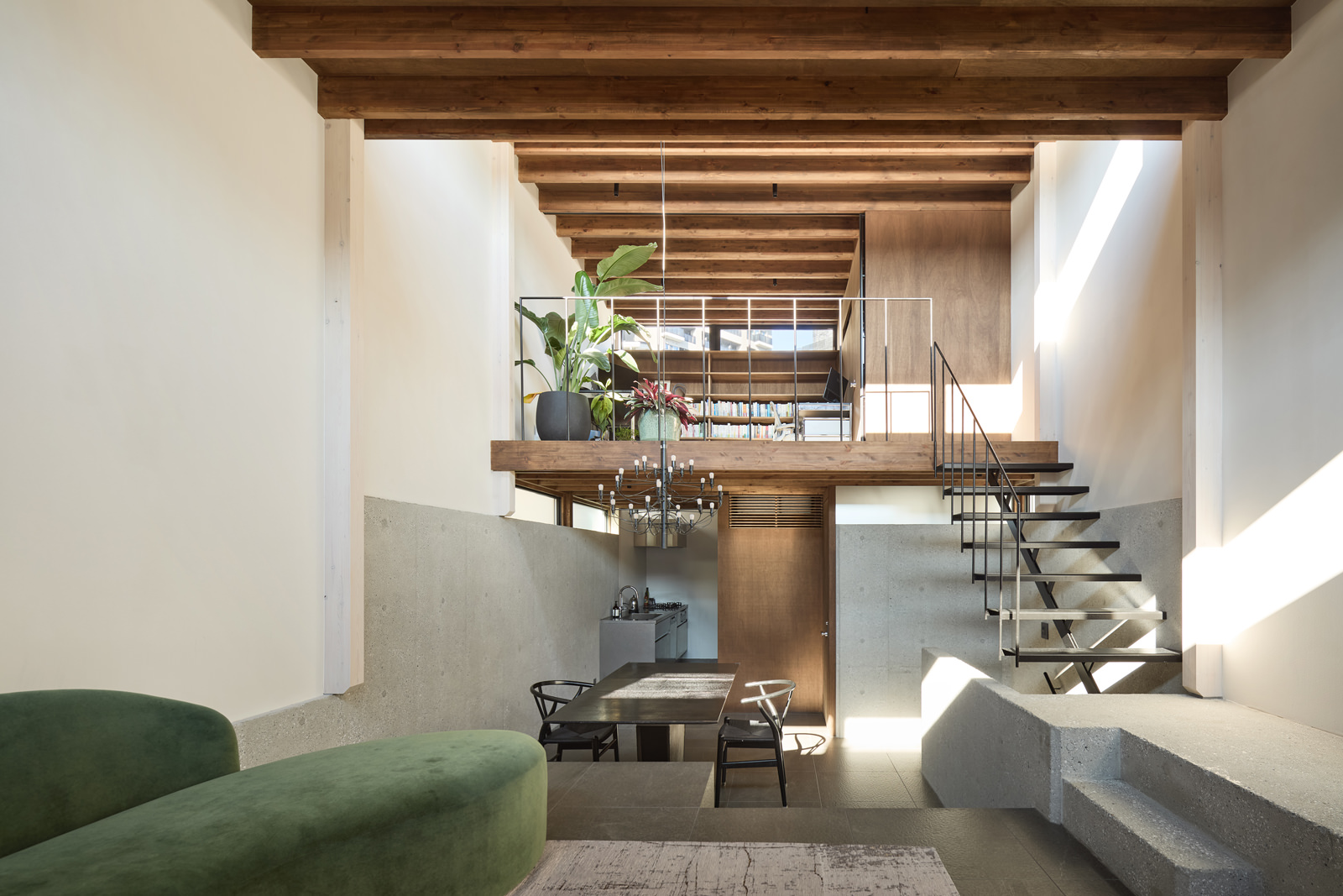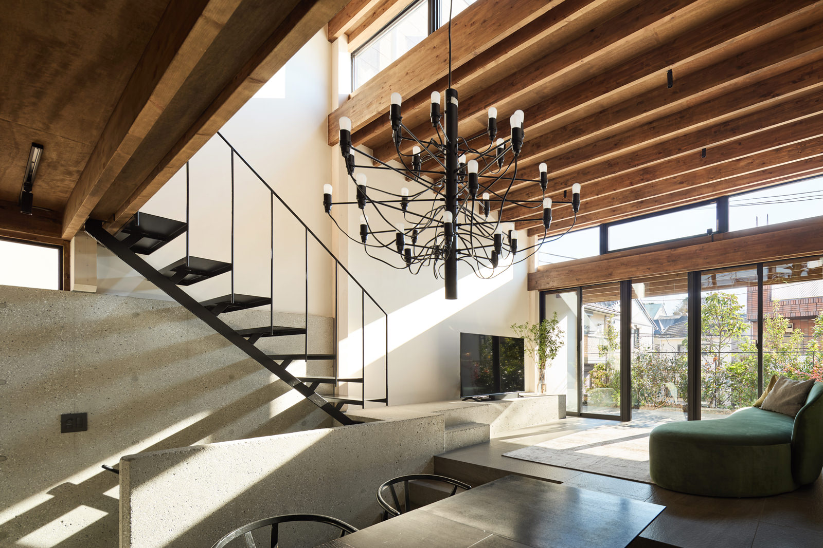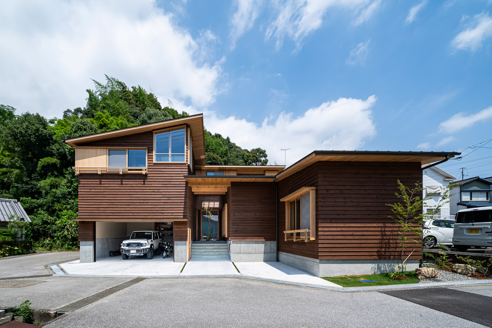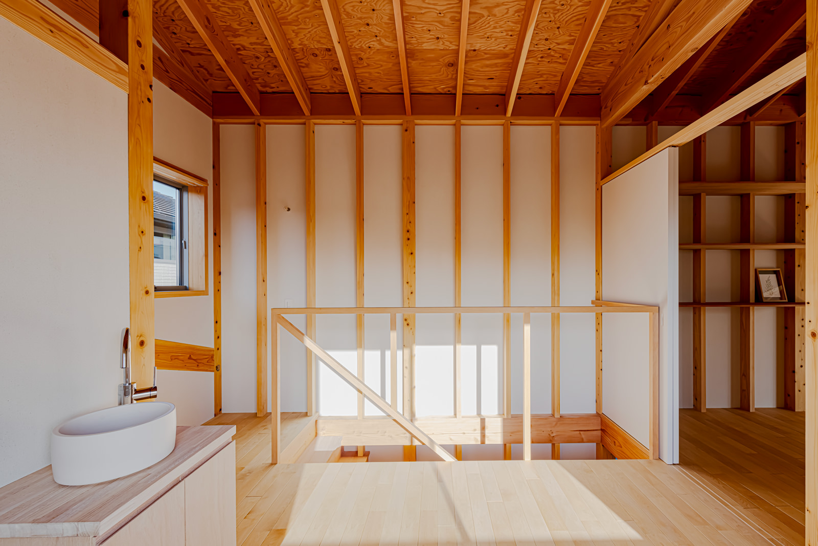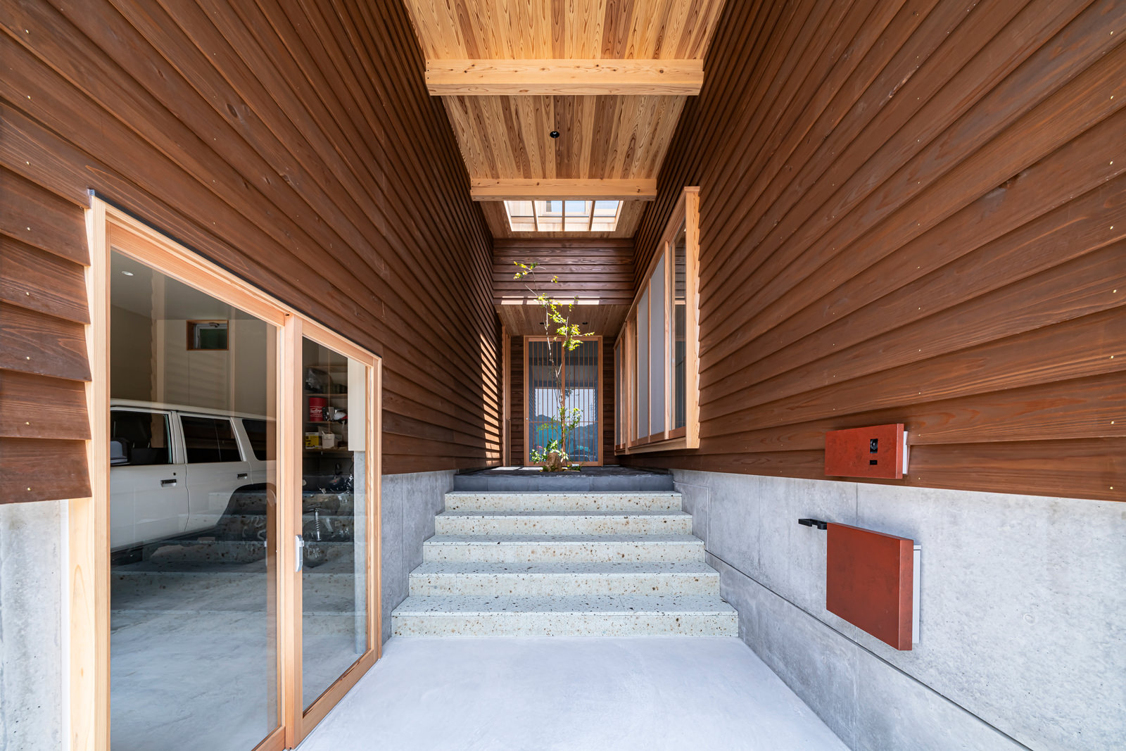 本計画は、高低差のある敷地条件に対し、生活動線と構造を調和させながら、施主の職能と素材へのこだわりを建築に映した住宅である。敷地は、前面道路から奥へと緩やかに下る地形を生かし、高基礎と路地のようなアプローチを設け、外と内をゆるやかにつなげた。施主は建築板金を生業としており、本建物の仕上げにも自ら携わった。