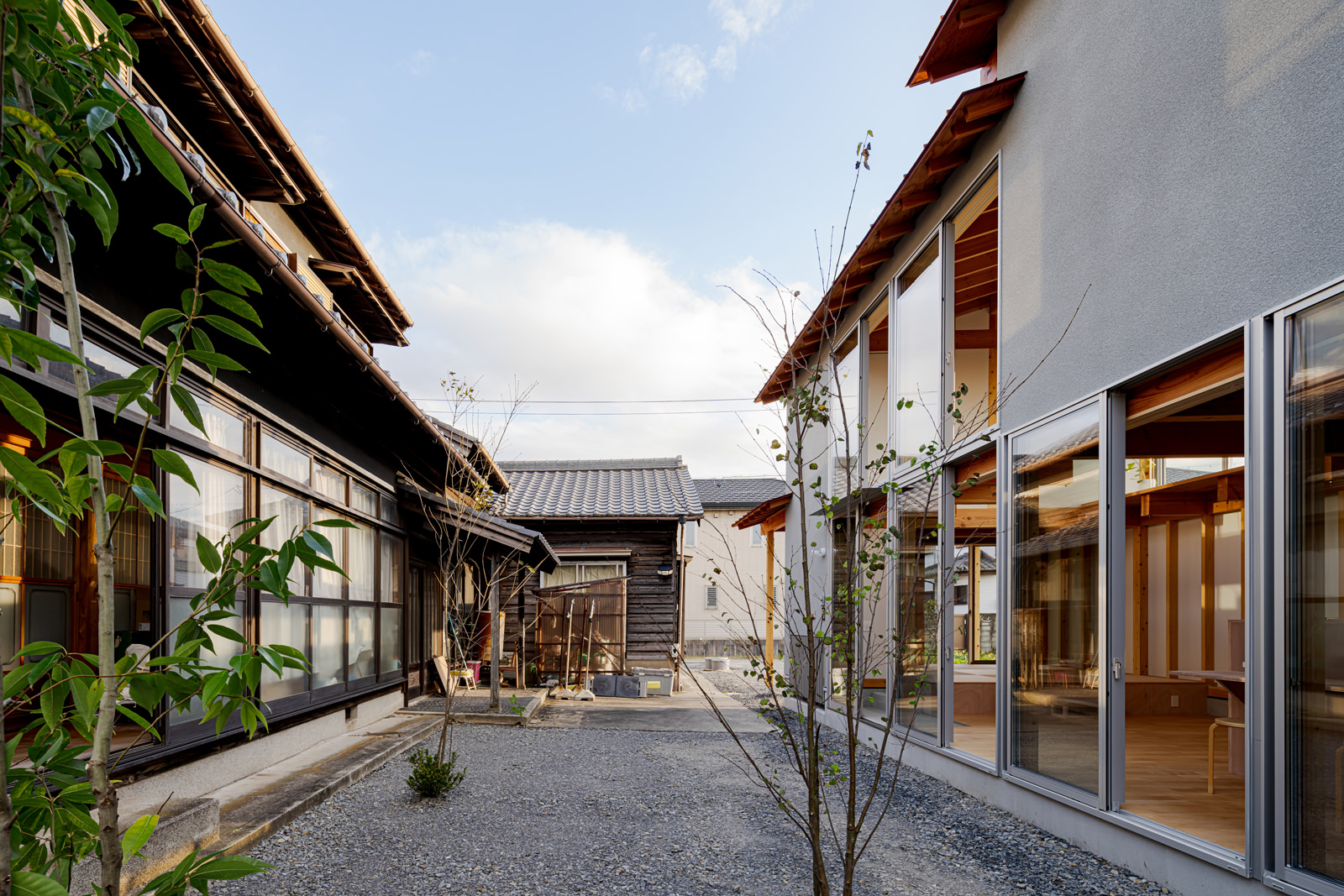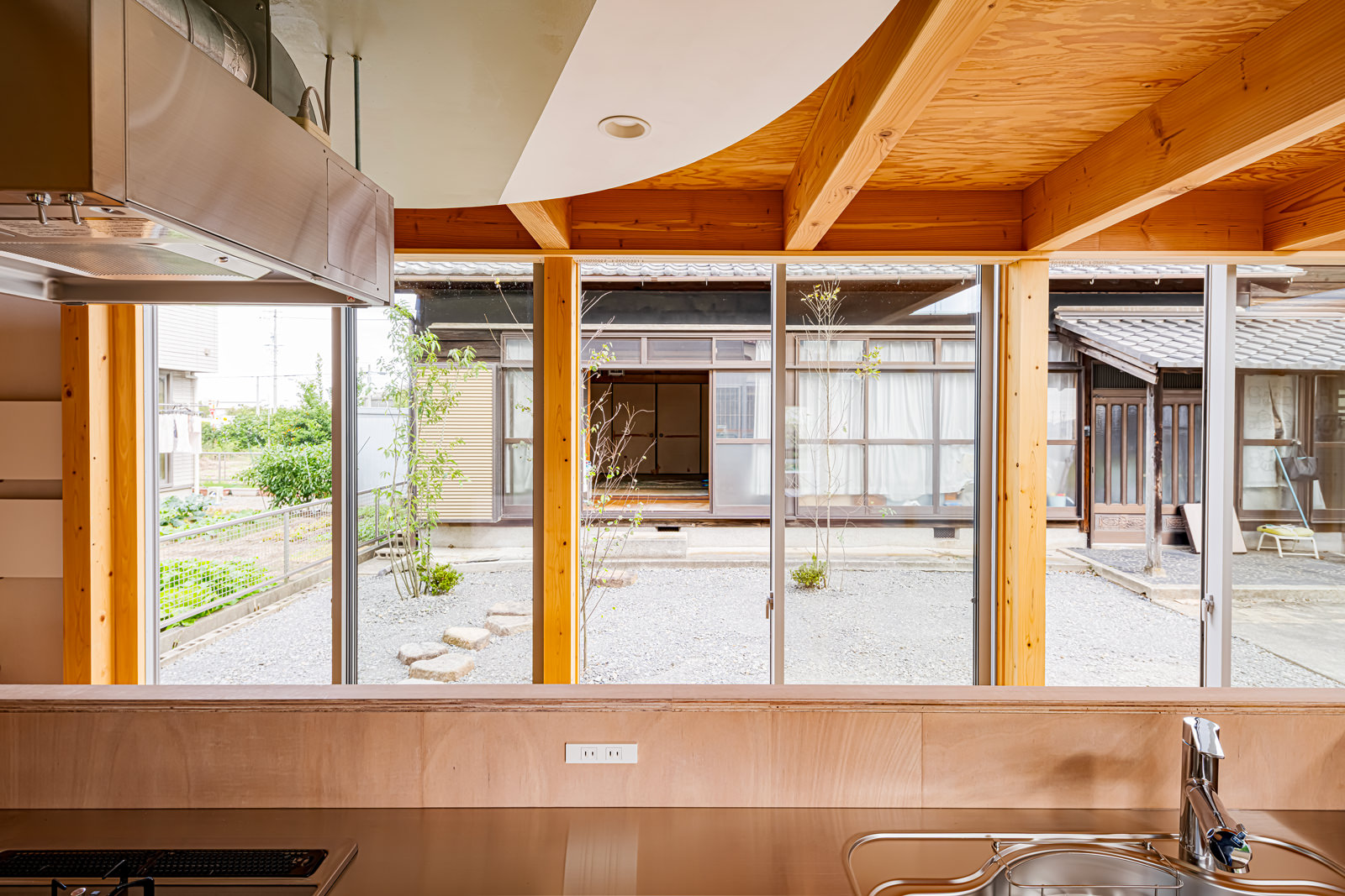 愛知県安城市の住宅。4世代がくらすため、既存家屋の隣に新たに1棟建てることとなった。別棟に住まうことで家族が乖離しないよう、つながりを意識させる建築にしたいと考えた。