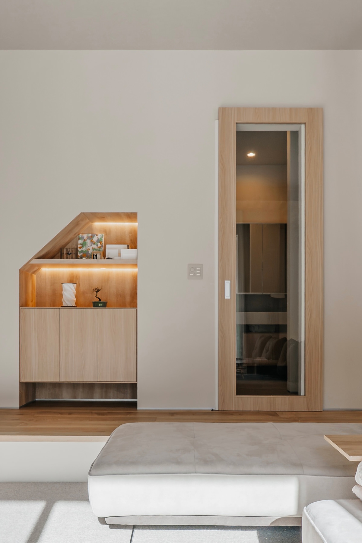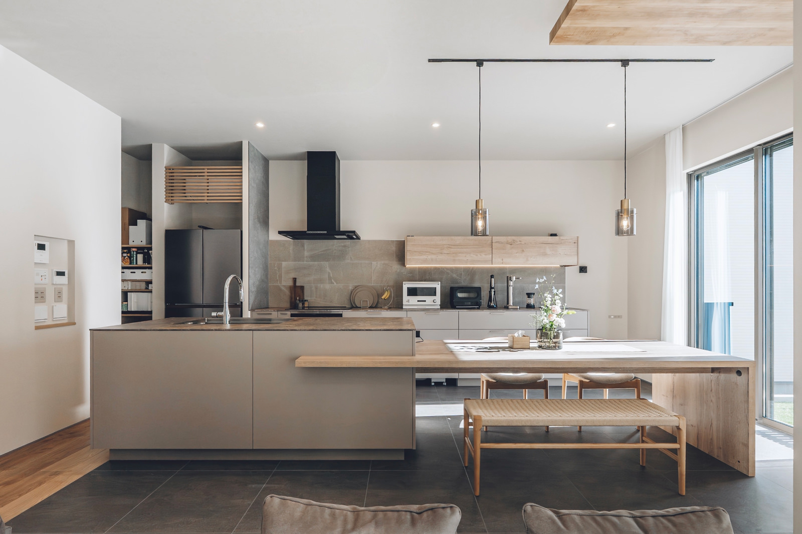 内装は、家族が寛げる開放感のある空間をテーマに、色味を抑えたジャパンディなテイストでまとめ、自然素材を感じられるミニマルなデザインを目指した。