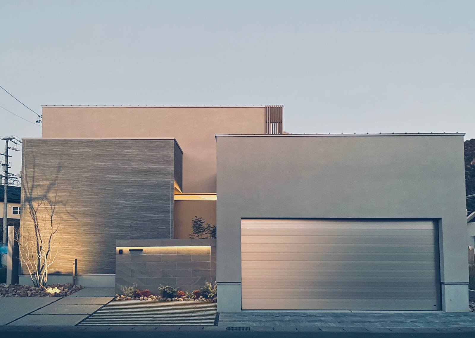 土地の間口いっぱいに配した建物とガレージは、奥行きのある立体感と存在感を演出しつつ、吹付の外壁や門塀、シャッター等の異素材も色調を揃えて統一。
