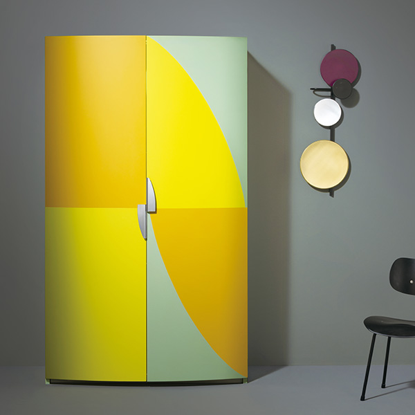 The distinctive AM 01 is a kitchen block made of wood panels with curved doors that can be positioned against the wall or free-standing. A surprising contrast appears when the cabinet is opened revealing glossy glass surfaces and stainless steel.