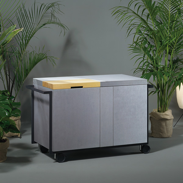 QB 01 is a compact mobile volume on wheels that eliminate boundaries of the home, perfect for outdoor use. Every element is minimal, yet functional: a cutting board hiding a sink, a compact fridge and a cutlery storage all cleverly stored inside.